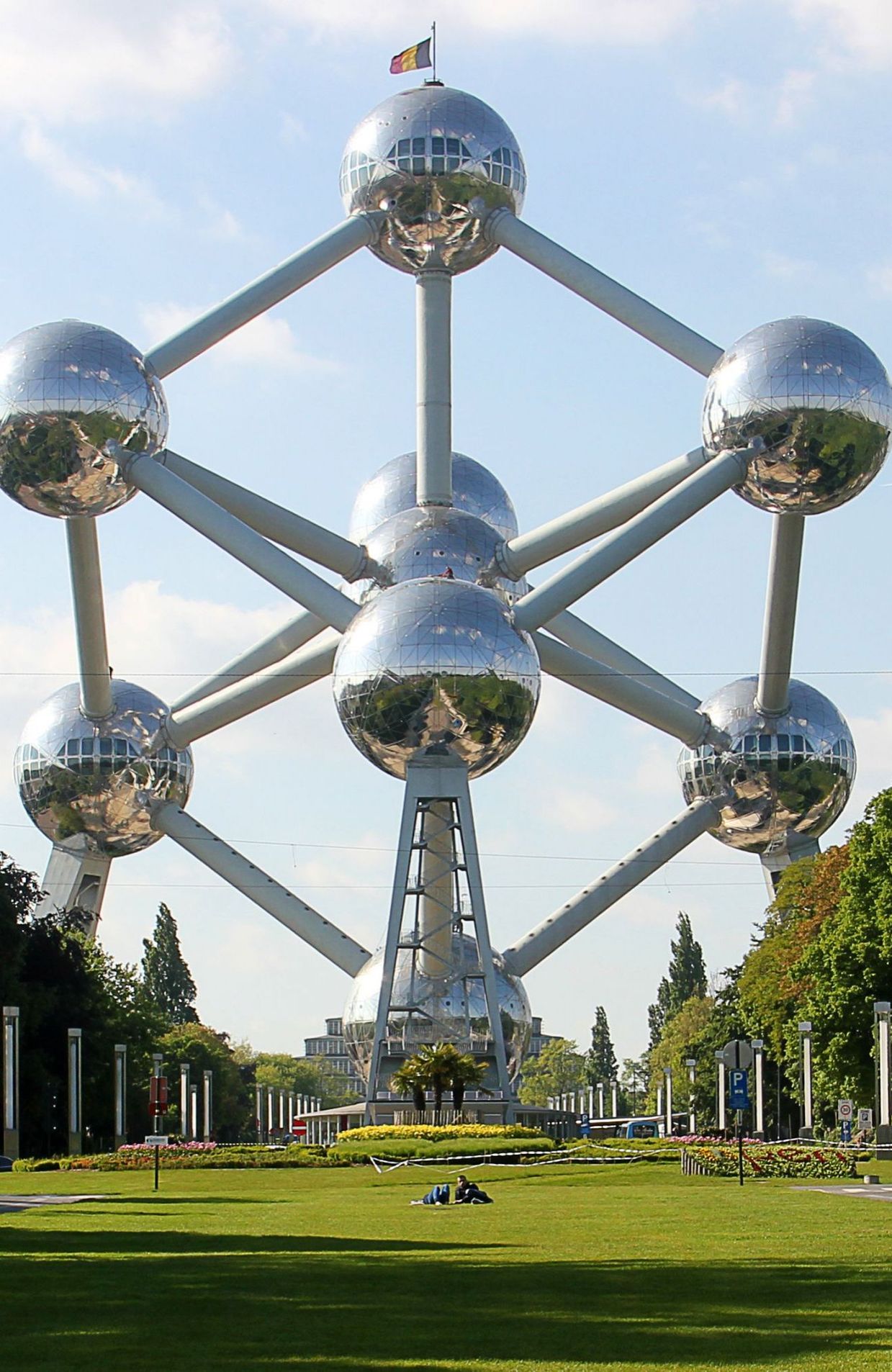 Rénovation L'Atomium, au seuil du xxie siècle, présentait un aspect terni, il était fortement dégradé par l’œuvre du temps, son étanchéité extérieure devenue inefficace et les éléments intérieurs de décoration et de mobilier au charme des années 1950 très abîmés. Seule la structure pouvait être conservée. En 2001, le projet de rénovation est enfin lancé grâce à un partenariat entre l’État fédéral belge, la Région de Bruxelles-Capitale et Bruxelles-ville. Réalisée par les sociétés BESIX et sa filiale Jacques Delens5, la rénovation a été entamée en mars 2004 et a pris fin en février 2006. La couverture originelle en aluminium a été remplacée par une nouvelle, plus résistante, en acier inoxydable, laquelle, en outre, est tout indiquée pour un monument symbolique du fer. Chaque sphère était recouverte à l’origine d’environ 720 triangles d’aluminium. Une partie d’entre eux a été mise en vente en guise de souvenir. Tous ont été remplacés, pour chaque sphère, par 48 grands triangles en acier inoxydable. En outre, ces nouvelles plaques sont plus résistantes que les anciennes. Elles leur ressemblent cependant car elles portent le dessin des triangles originels qu'elles remplacent, cela afin de conserver à l'Atomium l'aspect que l'on avait appris à connaître depuis 1958. Comme à l'origine, sur chacune des neuf sphères, des réseaux électriques animent celle-ci de points lumineux animés de rapides mouvements circulaires reproduisant les électrons qui gravitent autour du noyau atomique. Le travail de montage de ce nouveau revêtement a été effectué par une grue qui amenait les plaques à leur emplacement où elles étaient mises en place par une équipe de cordistes, procédé utilisé pour éviter l'installation d'énormes échafaudages.